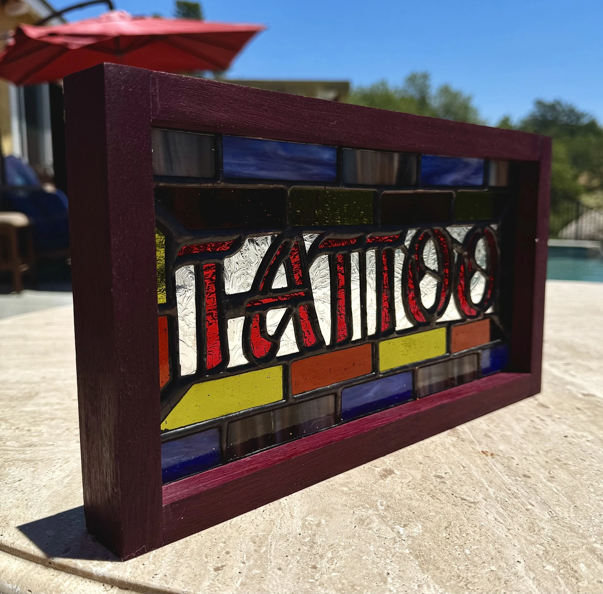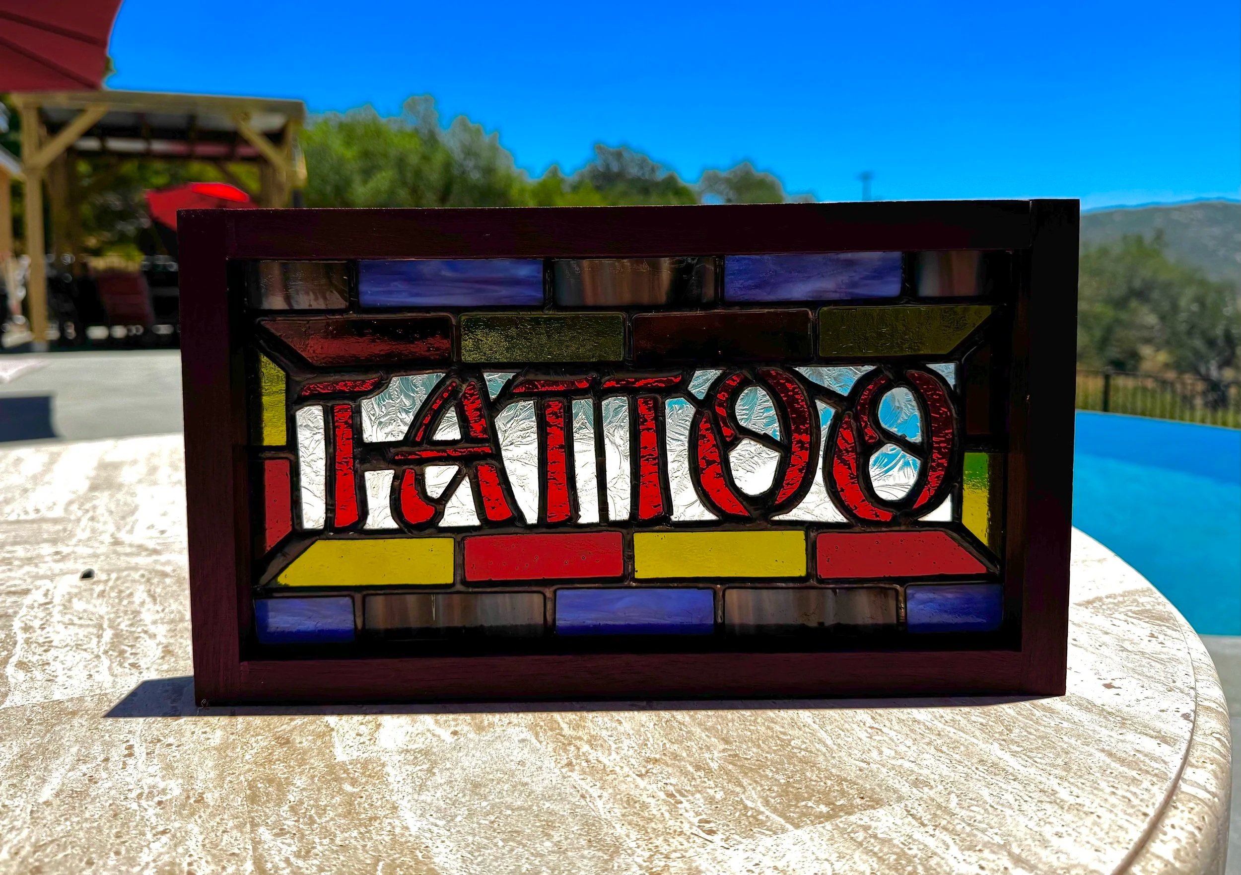 A friend of mine is a tattoo artist, and I suggested we do a trade - a stained glass window for a tattoo. We worked together to find a design she liked, color preferences, and came up with this 12x6 inch stained glass window framed with purple heart wood.